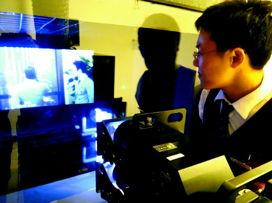 ◤27日晚上十点,张宝旺在放映最新上映的电影。他是济南新世纪影城的放映员,中秋节当天他从下午四点一直上班到凌晨零点三十分,“一个人分管6个放映厅,就是要为过节人们带来欢乐。” 本报记者 左庆 摄