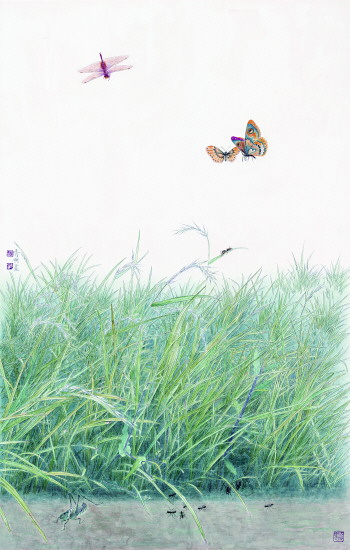 姚秀明,作为一名军旅画家,在创作态度上有着军人的严谨作风,在坚实的传统功力的基础上,他把创作思路的目光转向自己熟悉的生活,取材于司空见惯的事物。一些路边草,是常人踩过来走过去不认为美的东西,但是在姚秀明看来却是艺术创作最宝贵的艺术素材,白茅、抓地草、叫不上名的花草……再在野草丛中自然的添加动态十足的蜻蜓,蝴蝶,蚂蚁,蚂蚱等小生物,画面顿觉生气十足,富有生活情趣。