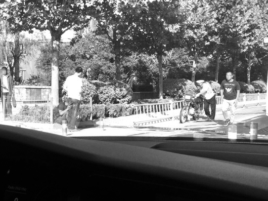 事发现场图片,小刘(右一)和交通协管员一起扶起摩托车,伤者(左边坐者)被奥迪和宝马车主扶到路边。王女士供图