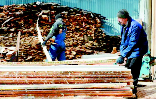 在中俄托木斯克木材工贸区,两名当地工人正在作业。 (资料片)