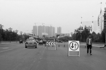 9月28日,东风路减河桥半幅封闭,桥梁检修,过往的车辆还需谨慎避让。 本报记者 马志勇 摄