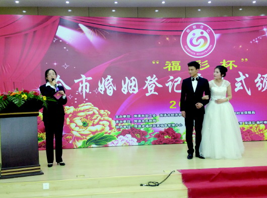 本报菏泽9月28日讯(记者 赵念东) “你是否愿意嫁给某某为妻,无论贫穷与富贵?”28日下午,在菏泽市民政局举行的首届“全市婚姻登记婚礼式颁证技能大赛”上,婚姻颁证员变身婚礼主持,为17对模拟的“新人”举办婚礼,并现场颁证。据了解,菏泽市民政局将在全市推广普及婚礼式颁证,现场登记和婚礼合二为一,倡导庄重、节俭却不失高雅的新婚俗。