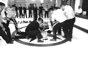 近日,莒县法院法警队组织开展处突演练。法警队针对近期出现的法官被伤事件,及时查找安全漏洞,加固安全保障警力。在实战演练中,以常发性和突发性安全事件为主要演练科目,使法警在执勤、安检中灵活运用处理方法,不断提高应对能力,确保遇事不慌、稳控秩序、有效化解,为法院安全工作再加一层防护网。图为:法警控制闹事“当事人”本报记者 王裕奎 通讯员 王明龙 崔梦醒 摄影报道