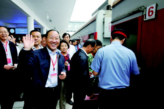 28日8时48分,从滨州开往北京的K1786次列车一声笛鸣驶出滨州站,宣告滨州市结束了没有旅客列车的历史。图为乘车代表登上火车前,高兴地挥手致意。 本报记者 李运恒 摄
