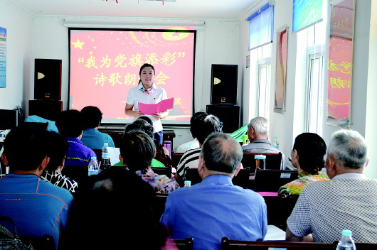 9月21日上午,后坡街社区组织党员举行了“我为党旗添彩”诗歌朗诵会。《我的祖国,我爱您》、《旗帜更鲜艳》、《歌颂祖国》等,一首首诗歌或慷慨豪迈,或感人肺腑,深深感染着在场的每一个位党员,时不时爆发出热烈的掌声,把朗诵会不断推向高潮。