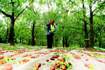 枣农用竹竿敲打着,枣树一阵乱颤,红枣噼哩啪啦落下来。