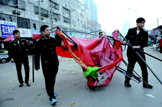 执法部门对中和路菜市场进行集中清理。本报记者 邓兴宇 摄