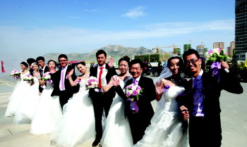 29日,中建八局青岛公司为职工举办的“庆国庆 山盟海誓”集体婚礼在黄岛区百果河西岸举行,6对经历了艰辛异地恋的情侣在工友的见证下,迈入幸福的婚姻殿堂。