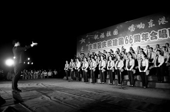 29日晚,在东港区政府广场上,由东港区委宣传部主办、东港区文体新局承办的庆祝建国66周年“祝福祖国,唱响东港”合唱比赛举行。来自东港区16个单位的合唱队,激情唱响《祖国万岁》《光荣与梦想》《共筑中国梦》等新老主旋律歌曲,引来众多群众观看。 本报记者 刘涛 摄影报道