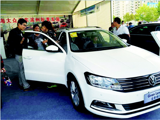 在29日开幕的齐鲁车展上,几位市民正围着一款喜爱的车咨询。本届齐鲁车展为期四天,趁着国庆,需要购车的市民快来滨州汽车总站东广场选购您喜爱的座驾吧。 本报记者 谭正正 摄影报道