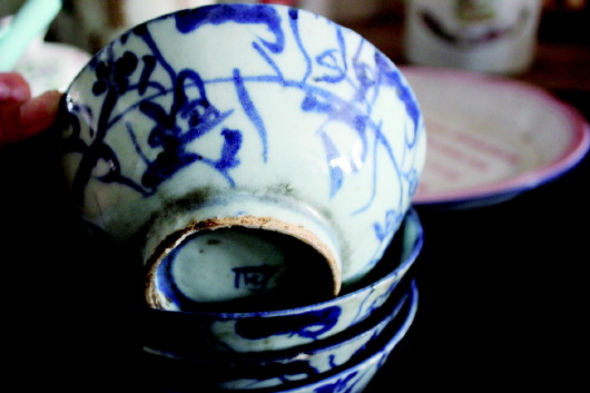 青花瓷碗:表面画工粗狂,或许出自民窑,当年为了满足市场需要,民窑粗瓷产量增加,此碗共4件,碗口稍有破损,碗底有印记,碗口宽14cm。