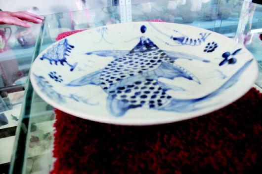 青花瓷鱼盘:明代,盘身画有鱼的图案,画风、瓷质、釉色符合明代特点,景德镇瓷,口径26cm。