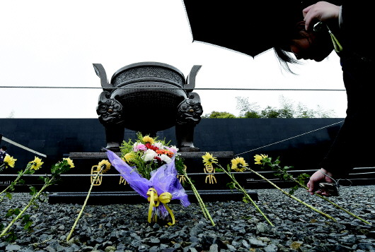2015年清明节期间,参观者在侵华日军南京大屠杀遇难同胞纪念馆国家公祭鼎前献花。(资料片)