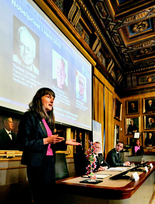 一名瑞典科学家、一名美国科学家和一名拥有美国和土耳其双重国籍的科学家因在DNA(脱氧核糖核酸)修复方面的研究而分享2015年度诺贝尔化学奖。