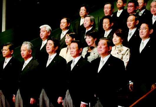 10月7日,在日本东京首相官邸,日本首相安倍晋三(前排中)与新内阁成员合影。 新华/美联