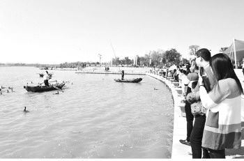 6日,太白湖景区北湖阁前的湖面上,41只黑褐色的鸬鹚(又名鱼鹰)站立在木舟上,渔人挥动竹篙向船舷一扫,鸬鹚们齐刷刷钻进水里捕鱼去了。等鸬鹚有所捕获,渔人便用竹篙在其身边一挑,鸬鹚就稳稳站在竹篙跳到了船上,渔人捏住其喉咙一挤,捕到的鱼便从鸬鹚喉咙处吐将出来,落到了渔人的竹篓里……这种鲜活的捕鱼场景,让小朋友们大饱眼福。