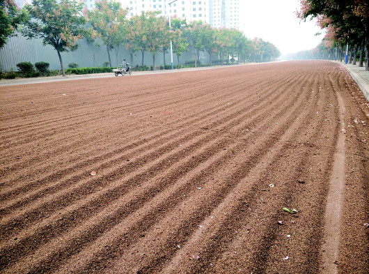 6日上午9时许,记者来到松花江路与桂陵路交叉路口。“顺着这个路口往北走,你就闻到了。”在一居民指引下,记者继续沿桂陵路往北前行,走了不到200米的距离,一股刺鼻难忍的酒精味扑鼻而来。再往前,便看到路面上铺满了一层暗红色的渣状物,而先前闻到的难闻气味正是这些东西散发出来的。记者在现场看到,路面上晾晒的渣状物一直延伸至桂陵路最北端,长约四五百米,20余米宽的路面,只在道路东侧留下不到5米的距离,来往行人皆掩鼻而过。
