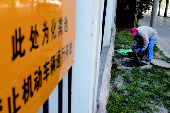 在张店新村路上的电业局第三生活区,物业工作人员正在对化粪池井盖进行检修。