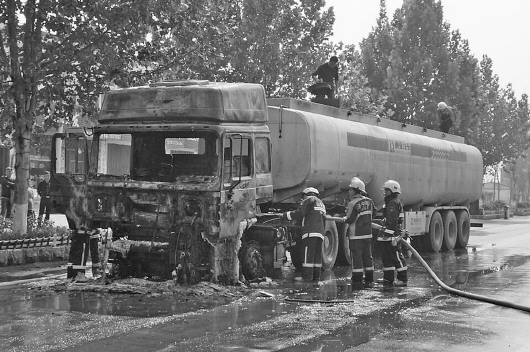 当地派出所民警赶到现场,由于事先没联系上司机,不知道油罐车内装运的什么,担心发生爆炸事故,民警立即封锁了附近路段交通,疏导过往车辆绕行。“当时整个驾驶室都着起来了,火苗蹿得很高,浓烟不断向外飘散。”马先生说,火越烧越烈,没人能够靠近。