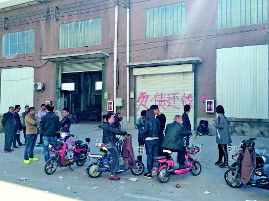 维权业主在金鑫物流仓库门上涂上了“欠债还钱”字样。 本报记者 刘飞跃 摄