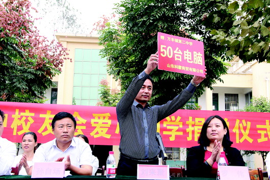 刘来聚是山东科霸商贸有限责任公司董事长,近年来,他依靠科技创业,经过努力,事业越做越强。成功之后不忘母校巨野县万丰二中的培育之恩,在得知母校缺少电脑等办公设备时,及时无私捐赠50台电脑。“能够捐赠万丰镇二中,是我多年来的梦想,在回报母校教育之恩的同时,还能勉励学弟学妹们,让他们把学习作为人生进步的阶梯,珍惜来之不易的学习机会,发愤读书,勤奋学习,努力掌握科学文化知识,不断开阔视野,希望他们争取早日成才,回报社会、回报家乡父老、回报母校。”刘来聚在捐赠仪式上深情地说。