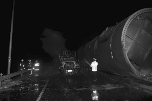 13日凌晨,一辆载有32吨汽油的油罐车突然起火爆燃,共造成三车被烧毁,三人受伤。 高速交警供图