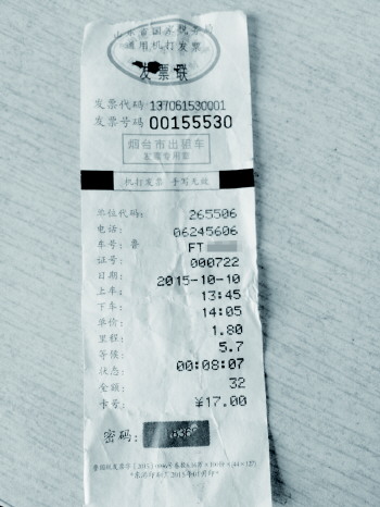 好在王先生手里有乘车发票。王先生拿出发票说,打车能报销,每次乘坐出租车时他都索要机打发票,上面很清楚打印着出租车车牌号是FT62××。