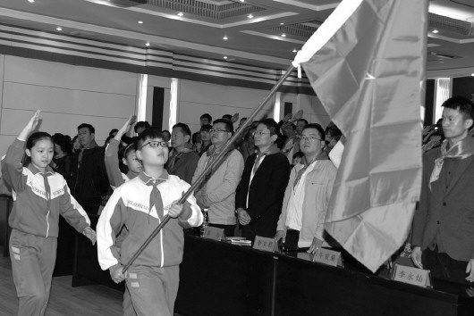 ◥牡丹区实验中学初一换戴大号红领巾仪式。通讯员 邹爱武 摄