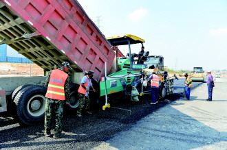 在荣乌高速建设现场,机械轰鸣,部分路段已启动路面沥青铺设工作。按照计划,他们要在半个月内完成经济开发区至滕家镇4公里路段的路面铺设。