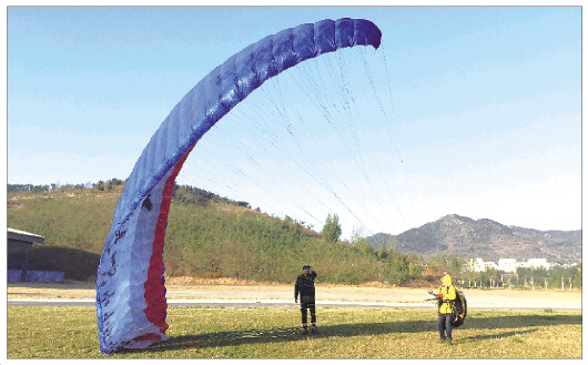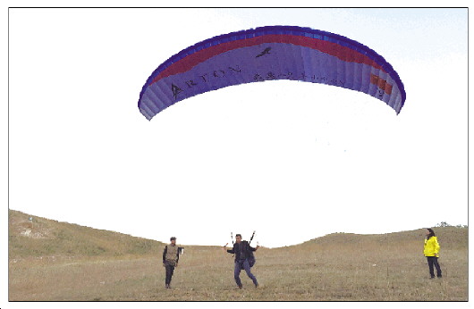 张伟向记者讲解完基础的理论知识之后,便“拽”着记者进行了首次试飞,“松A组,继续跑起来……”试飞完第一次之后,张伟说,在进行上课前,一定要做好准备工作,有了好体力才是运动的根本。而且,现在国内学滑翔伞的女学员也越来越多。