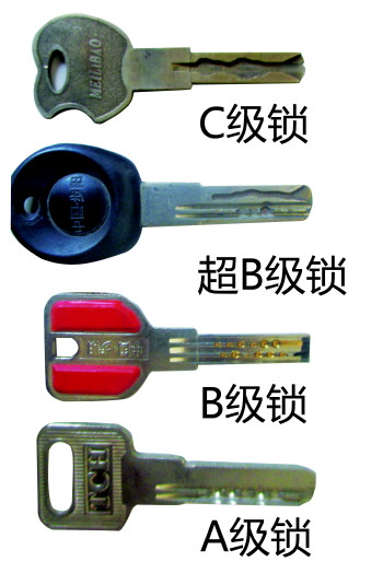 四种锁具的结构不同,从钥匙的外表上最容易辨认,A级锁采用的是单排弹珠,钥匙上只有一排弹珠凹槽,或者如十字锁等,虽然没有凹槽,但是有对应弹珠的凹陷;B级采用双排弹珠,可看到两排弹珠凹槽,而超B级将叶片结构与弹珠结构结合,两排弹珠凹槽外,还有一个叶片型的内铣槽;C级锁完全采用叶片结构,钥匙正反两面均为大叶片形状的内铣槽。