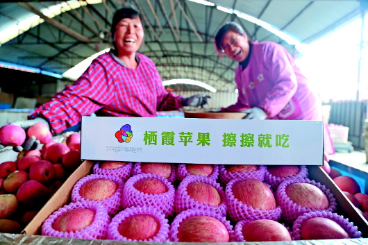 10日,栖霞桃村一处苹果贸易市场,几位村民在分拣苹果。 本报记者 吕奇 摄