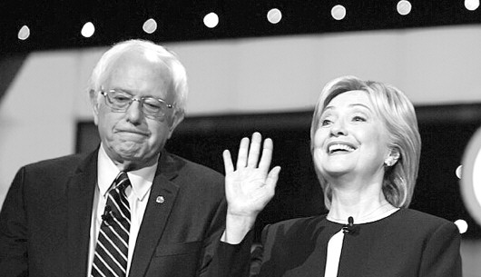 希拉里在辩论中与桑德斯(左)唇枪舌剑。