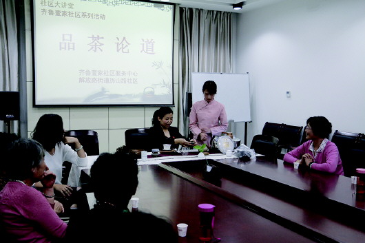 14日,齐鲁壹家社区服务中心、历山路社区联合茶马史诗为居民带来了精彩的茶道表演。居民们品茶论道,学习普洱茶的沏泡方法,互相交流喝茶的乐趣。图为社区居民在茶艺师的指导下,学习茶道艺术。 本报记者 许建立 摄