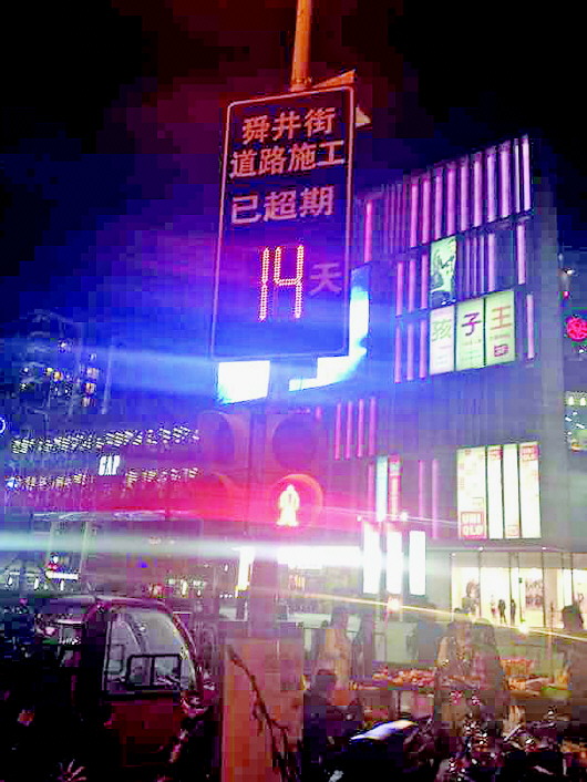 除了超期施工公示牌,在化纤厂路和工业南路交叉口,正在施工的化纤厂路也挂起了施工倒计时牌,化纤厂路施工预计在11月15日结束,路口的施工倒计时牌上的LED灯近日显示离施工结束还有35天。历下区市政局工作人员表示,施工倒计时牌为济南市交警部门悬挂。