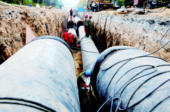 在华鲁恒升热力汽改水供暖管道改造现场,工人们在加班加点施工。 本报记者 马志勇 摄