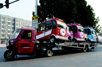 一名腿有残疾的驾驶人无证开着一辆由三轮摩托车牵引的自造“半挂车”,上面装载着六辆电动三轮车,从聊城市高唐县奔波百里来平原县坊子乡的一个电动车销售点送货,该车行至平原县城时,被执勤交警查获。民警将根据相关规定对其进行处罚同时将挂车予以收缴并强制报废。