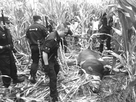 疯牛被特警队员击毙。通讯员 夏艳敏 摄