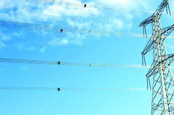 连日来,在东港区陈疃镇附近两座基塔间,电力工人在高压电线上“走钢丝”完成电缆安装。地面有3个人拉着绳索,并现场指挥上面工人前进。