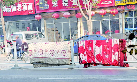 在马路中间晒被子的行为是要挨罚的。(资料片)