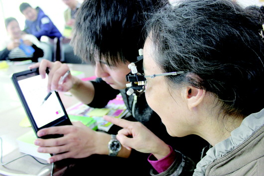◤配眼镜前,先为老人验光。本报记者 崔岩 摄