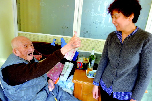 李玉柱老人跷起大拇指感谢房泽秋。(资料片) 本报记者 肖龙凤 摄