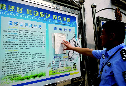 王文明下社区,向记者介绍西卢警务区的警情通告。