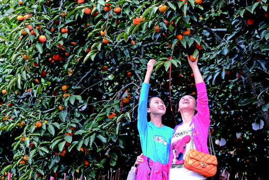 游客在享受采摘柿子的乐趣。(资料片)