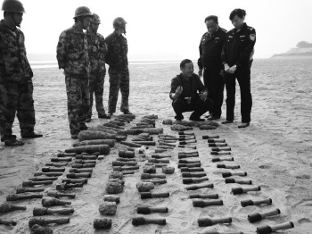 在黄河滩废旧炮弹、手榴弹和雷管等等待爆破。 刘潇 摄