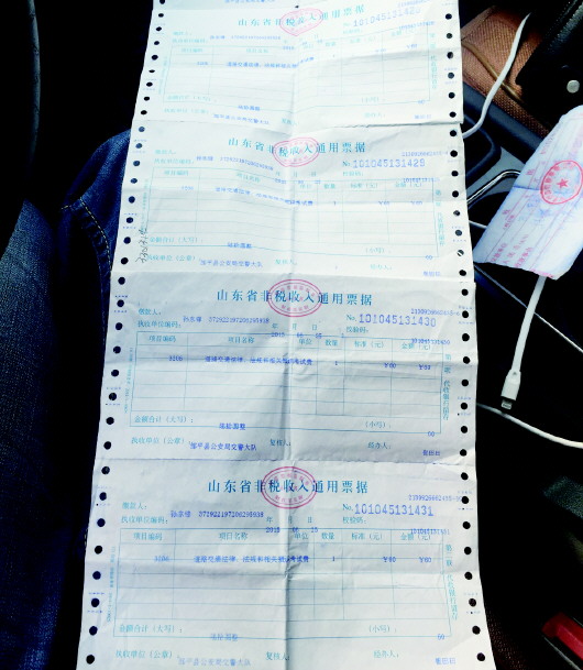 邹平县车管所给孙先生开的4次补考费用发票(左),以及孙先生交给驾校的第一次补考收费单据(右)。