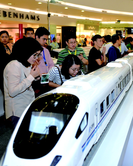今年8月13日,在印尼首都雅加达举办的中国高铁展上,参观者在观看中国高铁模型。