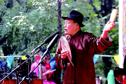 16日,千佛山九月九山会鸣锣开场,山会上除了来自全国各地的商贩卖土特产,还有各种非遗项目展演,十分精彩,图为山东落子非遗传人徐立平在表演非遗项目“凤凰三点头”。