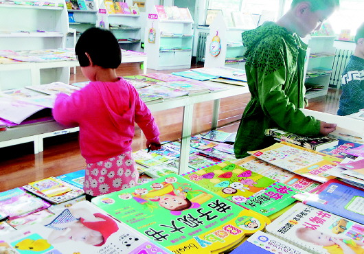 小女孩在书店看书,随手牵着绳子,是怕哥哥走了吗?