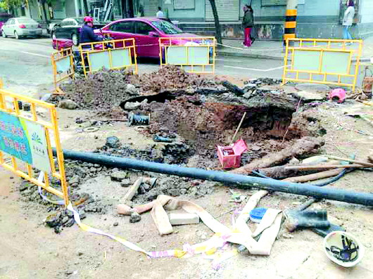 现场水管被压坏后,正在抢修。 本报记者 李阳 摄